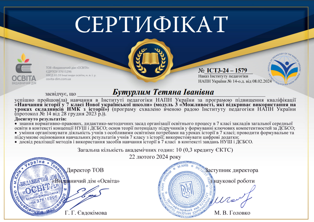 355. Успішне завершення онлайн-курсу "Шкільне життя онлайн: як вчити і вчитися із задоволенням" (Центр освітніх ініціатив; ГО “Демократична школа”, навчальна платформа Європейського центру ім. Вергеланда; № YStGAbiHCx; 17.03.23-13.05.23, 30 год).